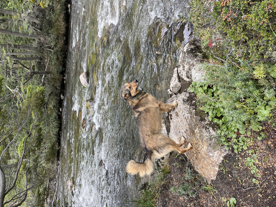 - "A tan and brown dog stands on a rock near a flowing river" by FM-SiGDg2, licensed under CC BY 4.0