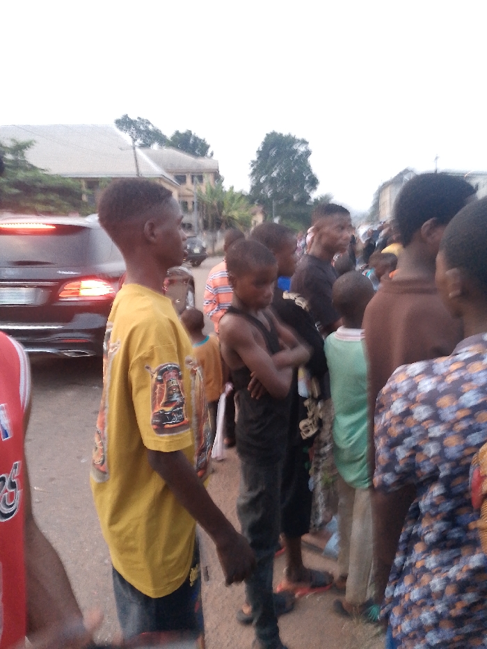 A group of people, mostly children and young adults, are standing on a street