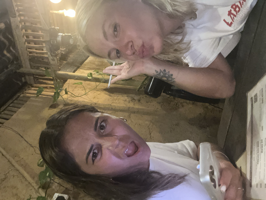 The image depicts two adult females seated at a dark wooden table within an establishment in Nilwella, Sri Lanka, during nighttime hours. The female on the left, with dark hair and wearing a white t-shirt, holds a silver smartphone in her left hand and displays an exaggerated open-mouthed expression with her tongue partially visible. She has hoop earrings. The female on the right, with blonde hair and wearing a white t-shirt, holds a lit cigarette between her fingers and poses with pursed lips. A circular tattoo is visible on her inner right forearm. A paper menu with text and a QR code is partially visible on the table. The background features a textured, yellowish-brown wall with green climbing plants, wooden slat structures, and two exposed hanging light bulbs. A black object, possibly a mount or fixture, is positioned behind the female on the right. The scene is illuminated by artificial lighting, indicating an evening setting.