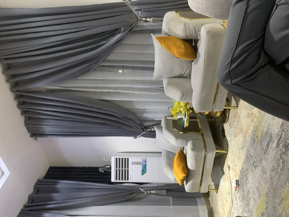A living room features gray curtains with a light sheer layer underneath. A light gray sofa with gold accents and yellow cushions sits near a glass-topped table with assorted items. An air conditioning unit is visible in the background. The room has gray carpeting and is illuminated by overhead lighting. Part of a gray outfit is in the scene, likely worn by someone taking the picture.