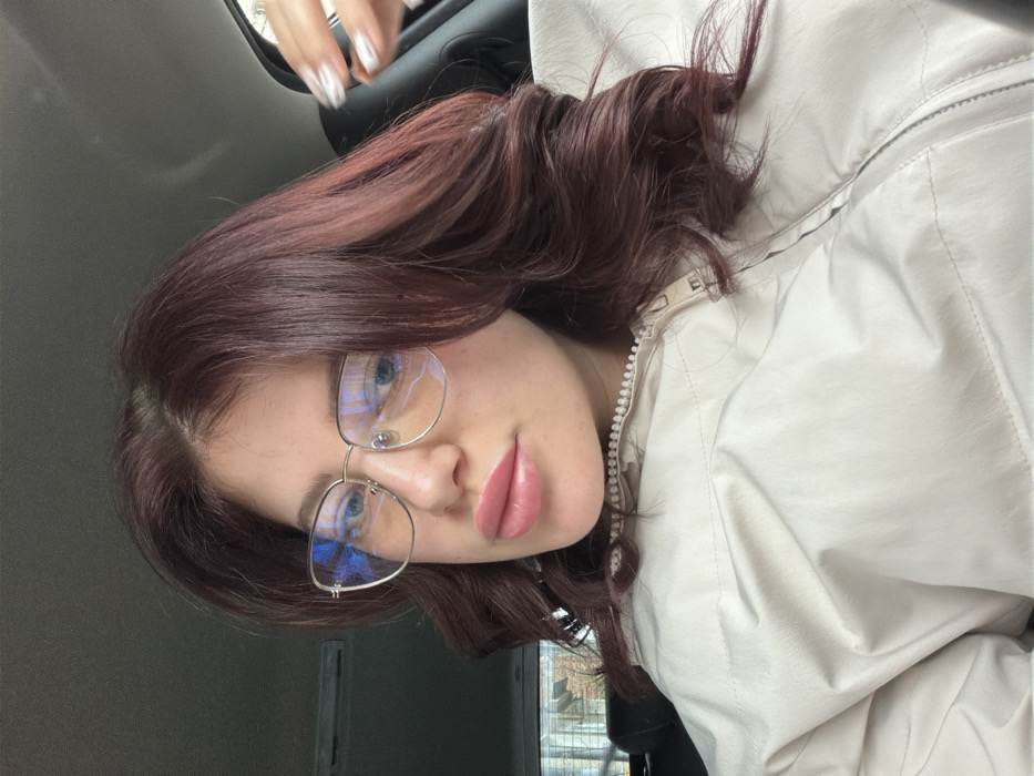 A female individual is depicted in a close-up, chest-up image, seated within the interior of a vehicle in Nova Zagora, Bulgaria. She possesses dark reddish-brown, wavy, shoulder-length hair parted on the side. She wears square-framed spectacles with thin metallic frames, the lenses of which display blue anti-reflective coatings and reflections. Her lips are full, appearing to be enhanced, and are coated with a pink lip product. She is clad in a light beige or cream-colored puffer-style jacket, featuring a visible front zipper that is partially fastened. The zipper pull matches the jacket's color. Her right hand is partially visible in the upper right, displaying long fingernails with a metallic or gradient white-to-silver manicure. The immediate background shows elements of the vehicle's interior, including a dark headrest and a light gray roof lining. Through a window on the left, a blurred exterior scene is visible, comprising architectural elements and faint vegetation, consistent with an urban or suburban environment.
