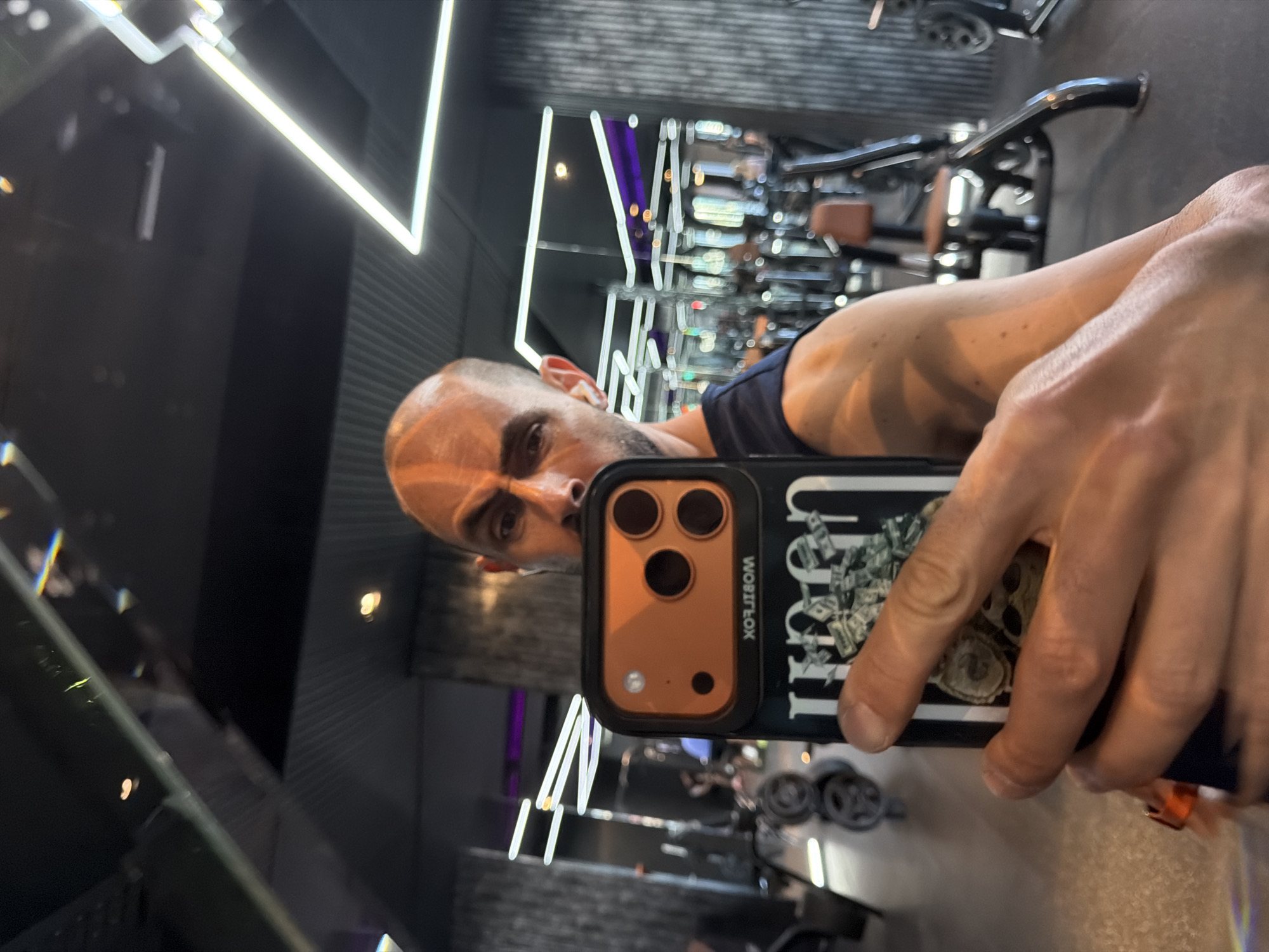A man takes a selfie in a gym in Plovdiv, Bulgaria, reflected in a mirror. The man is bald, has a beard, and is wearing a blue top. He holds a phone with a brown camera and a black case adorned with an image of money and skull. Gym equipment and lighting fixtures are visible in the background. The surfaces visible, including the mirror, walls, and some equipment, have a grayscale color palette.