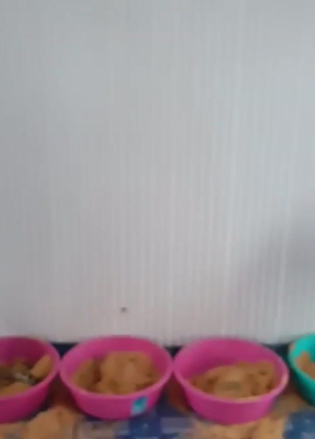 cat going to different bowls of wet food. The cat climbs into the bowl and eats, making a mess of the wet food around the bowl. The bowls are pink and green, and there are four of them. They are placed on a blue patterned surface. A white, vertically-ridged wall is behind them.