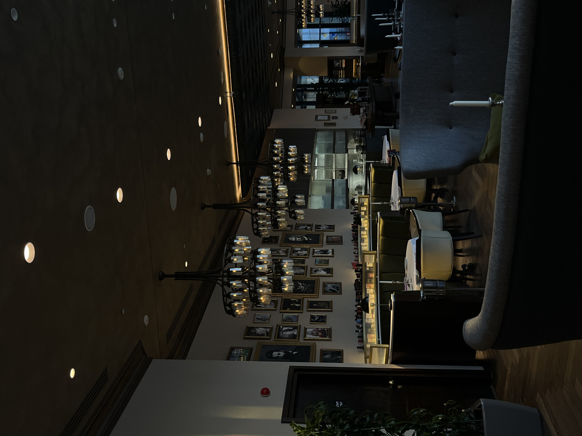 The image displays the interior of The Ginza restaurant, located within Sense Hotel Sofia, Bulgaria, characterized by an upscale, dimly lit ambiance. The scene is captured at what appears to be evening or night, relying entirely on artificial illumination. The foreground features a gray upholstered high-backed sofa or banquette. Resting on a dark green cushion on this sofa is a single unlit white tapered candle in a silver holder. The flooring is dark wood with a herringbone pattern. The midground reveals the main dining area, configured with dark green upholstered booth seating and round tables draped with white tablecloths. Cream-colored chairs with dark legs accompany these tables. An empty silver ice bucket on a stand is positioned beside one of the tables. Behind the booths, an illuminated display shelf system holds numerous bottles, likely wines or spirits, along with small black table lamps. The left wall, light-colored, is densely covered with an array of framed portraits of various historical and notable figures, including a prominent portrait of Abraham Lincoln. A red fire alarm is mounted on this wall, above a dark door marked "STAFF ONLY." A large dark green potted plant is situated to the left of this door. In the background, to the left, a partially visible open kitchen or service area features stainless steel counters and shelving. To the right, large windows offer a view of an urban street scene outside, reflecting city lights. The ceiling is dark, with recessed circular lights, integrated ventilation elements, and decorative strip lighting along structural elements. Several large, multi-tiered chandeliers, each comprising numerous cylindrical glass light fixtures, hang from the ceiling, providing warm light. No individuals are present in the scene.