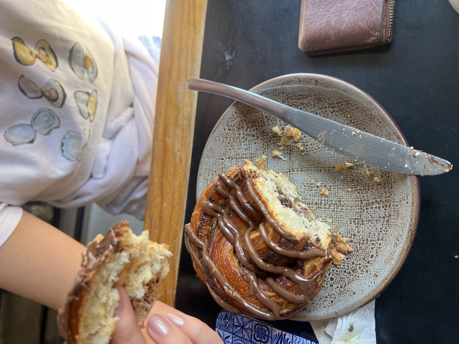 - "A close-up, high-angle view depicts a partially consumed chocolate-filled and drizzled laminated pastry on a textured, round ceramic plate set on a dark tabletop surface within a cafe or bakery in Mexico City, Mexico" by FM-pWsEE2, licensed under CC BY 4.0