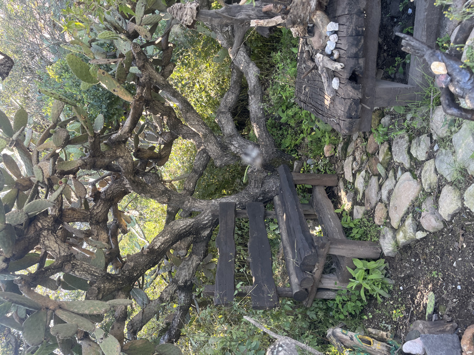 This image depicts an outdoor, rustic garden scene in Bernal, Mexico. The central feature is a large, mature *Opuntia* (prickly pear) cactus tree with multiple thick, gnarled, dark brown trunks and branches extending throughout the upper frame. Its pads are light green, and some exhibit reddish fruits. To the left of the cactus's base stands a dark-stained, rustic wooden bench constructed from rough-hewn logs and planks. It features a backrest composed of three horizontal wooden planks and a seat made of two parallel wooden logs. Green herbaceous plants grow at its base. To the right of the cactus, a low, square-shaped wooden table or platform, also dark and weathered with visible wood grain and cracks, rests on the ground. Arranged on its surface are several small, light-colored, smooth stones and a few pieces of weathered driftwood. Further to the right, a tall, slender piece of gnarled, dry wood, possibly a natural root or sculpture, stands upright. Near the bottom right, another piece of dark, gnarled wood displays a light-colored object, possibly a crystal or stone. A winding path made of irregularly shaped, light-colored flagstones or natural stones extends from the foreground between the bench and the table. The ground consists of dark soil with sparse green vegetation and weeds. Dense green foliage forms the background, suggesting a natural, vegetated environment. Sunlight filters through the overhead foliage, creating bright patches. No individuals are present in the scene. An indistinct, light-colored blur is present in the mid-ground, at the base of the large cactus.