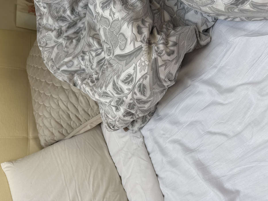 The image depicts an unmade bed within an indoor setting. The specific location within the city of Florence, Italy, cannot be determined from the provided visual information. The bed features a light-colored, possibly upholstered, headboard. On the bed, there is a white fitted sheet and two pillows. One pillow, positioned to the left, is a plain, light off-white color. The second pillow, located centrally, is beige with a quilted scalloped or seashell pattern. A duvet or comforter, patterned with a grey and white floral and foliage design, is rumpled and pulled up, partially covering the bed. A small, indistinct dark mass is partially visible beneath the duvet. No individuals are clearly visible. The overall scene suggests a recently occupied or currently unoccupied private bedroom space.