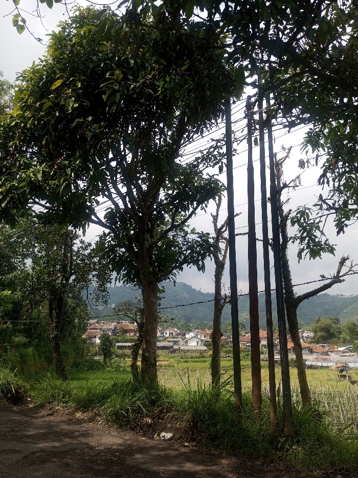 The image displays a semi-rural landscape in an unspecified location within Unknown, Vietnam, under an overcast sky. In the foreground, a dark, unpaved path is visible on the left, bordered by overgrown green grass and foliage. Several trees with dense green canopies dominate the left and center of the frame, partially obscuring the view. To the right of the central trees, five dark-colored utility poles stand vertically, supporting multiple overhead power lines. Some poles exhibit pruned or dead tree branches. Beyond the immediate foreground, an expanse of agricultural fields, likely paddy fields with visible rows of cultivation, occupies the mid-ground. Further back, a cluster of residential buildings, forming a village or hamlet, is visible with light-colored walls and roofs varying in shades of red, orange, and grey. A small, dark-roofed shelter or shed is situated within the fields on the far right. The distant background features rolling hills or mountains densely covered in green vegetation. No individuals or active subjects are present in the scene.
