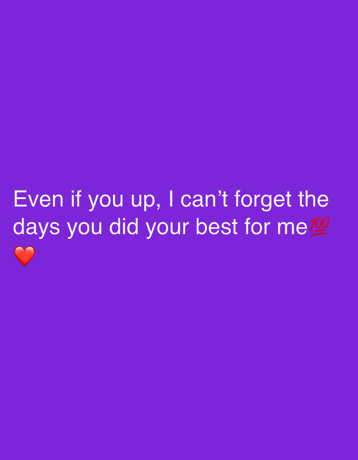 The image displays a uniform, solid purple background. White sans-serif text is centrally aligned in the lower-middle section, reading: "Even if you up, I can't forget the days you did your best for me". A red heart emoji (❤️) is positioned directly beneath the word "best", and a red "100" emoji (💯) immediately follows the word "me". The image is a digital graphic and does not depict any physical environment, objects, people, or actions, thus providing no visual information to establish a location in the city of Ojo, Nigeria, or any other physical setting.