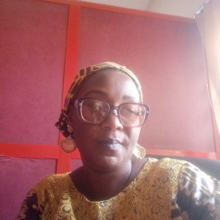 An adult female is depicted in a chest-up, forward-facing portrait. She has dark skin, wears rectangular eyeglasses with dark frames, and has dark-colored lips. Her head is covered by a headscarf featuring a leopard print pattern. She wears large, gold-toned, ornate dangle earrings. Her attire consists of a garment with a golden, textured or beaded pattern on the chest, layered over a darker, patterned fabric on the shoulders and upper arms. The background is an interior wall predominantly reddish-brown, segmented by brighter orange-red vertical and horizontal strips. A brighter light source is evident in the upper right background. The specific location within Kaduna, Nigeria, is not discernible from the provided image.