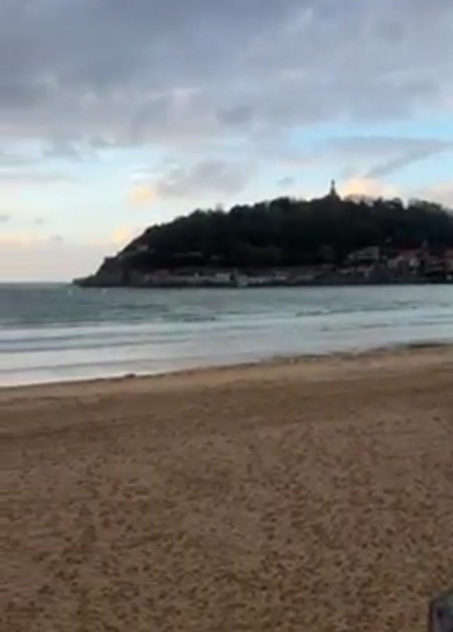 view of a sandy beach with a gentle, blue ocean. In the distance is a tree-covered landmass, possibly a small island or a promontory, with a structure visible at the top. The sky is overcast with gray clouds. As the video progresses, the camera zooms in towards the water, revealing several small sailboats in the distance. The waves are small and consistent, breaking on the sandy shore.