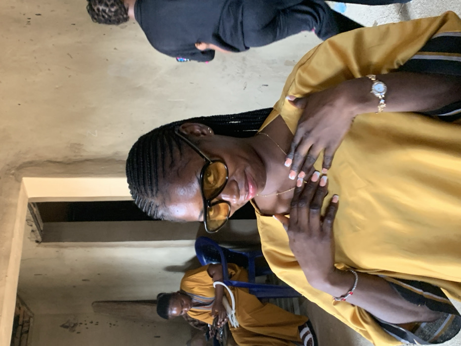 This image captures an indoor scene in Angwa Koyo, Nigeria, featuring three individuals. In the foreground, a woman with dark skin and cornrow braids faces forward, displaying a subtle smile with slightly parted lips. She wears dark-rimmed aviator-style sunglasses with yellow-tinted lenses, a loose-fitting mustard yellow garment with wide sleeves featuring black, white, and yellow stripes, a delicate gold-colored necklace, a red and white beaded bracelet on her left wrist, and a gold-colored watch with a light face on her right wrist. Her hands, with two-tone light pink and white nail polish, are clasped at chest height on her garment. In the mid-ground to the left, a second woman with dark skin is seated in a blue plastic chair. She is dressed in a mustard yellow garment, possibly a jumpsuit or dress, and wears white sandals. She looks down, engaged with a white smartphone held in her hands. To the far right in the background, a third individual is partially visible from behind, wearing a black t-shirt and black pants. Their hair appears to be styled in short, dark dreadlocks or braids. The environment consists of a room with rough, light brown or beige walls showing minor imperfections. A doorway is visible in the background, leading to what appears to be a brighter adjacent space. The overall lighting is bright and even.