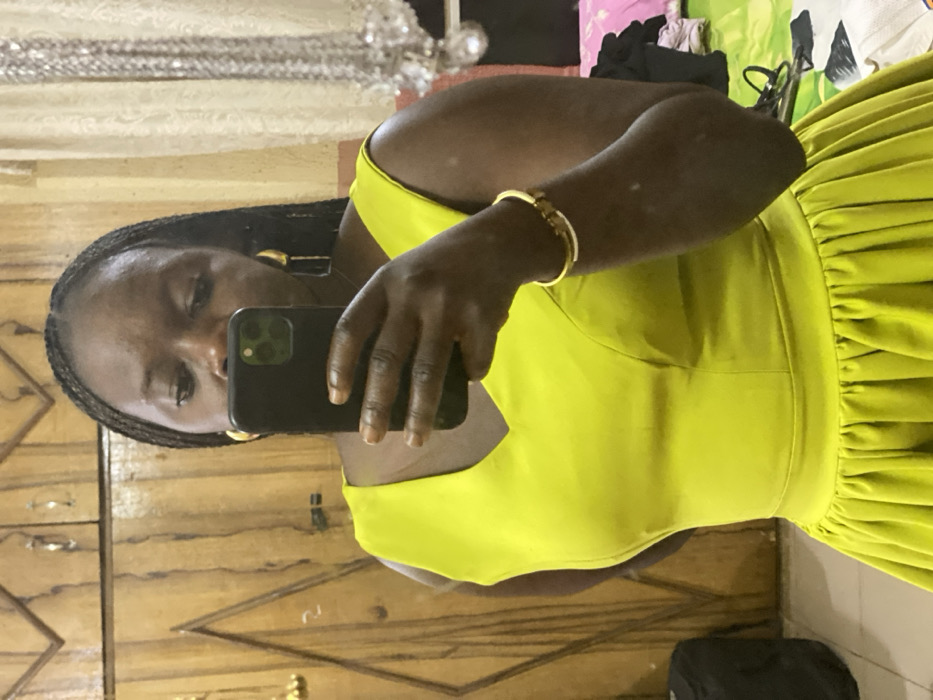 A woman is taking a selfie in a mirror. She is wearing a bright yellow dress with a fitted bodice and a gathered skirt. Her hair is styled in braids. She is holding a black smartphone in her right hand, partially obscuring her face. The reflection shows a cluttered room with clothes and other items in the background. A gold bangle is visible on her wrist, and gold hoop earrings adorn her ears.