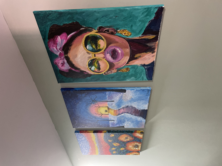 Three vertical rectangular canvas paintings are displayed on a light gray-green wall in Oreshak, Bulgaria, beneath a white ceiling