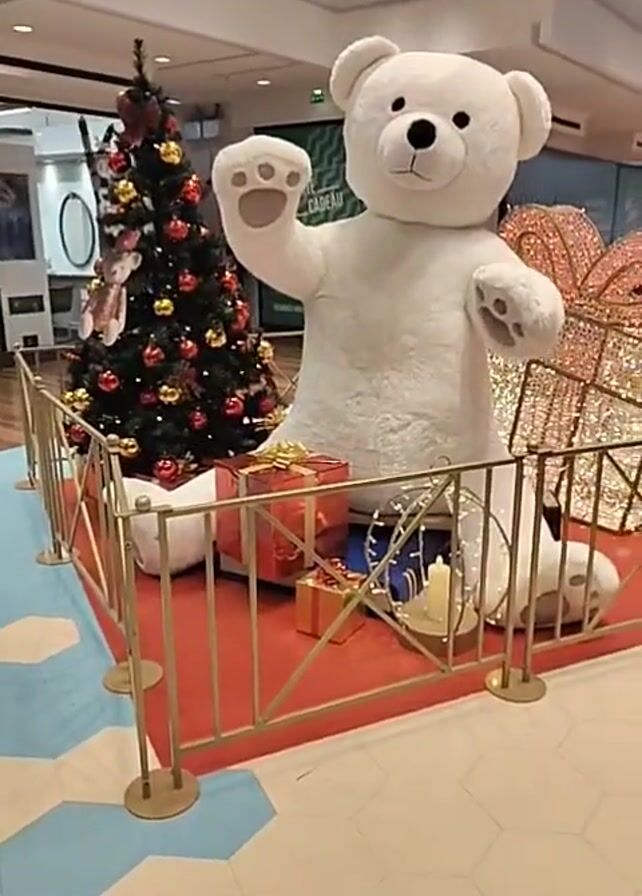 Christmas display in a mall or shopping center. There is a large, white teddy bear standing inside a gold fence, along with a Christmas tree, several wrapped gifts, and a large, light-up gift box. The floor has a hexagonal pattern with light blue and cream colors. People can be seen walking in the background.