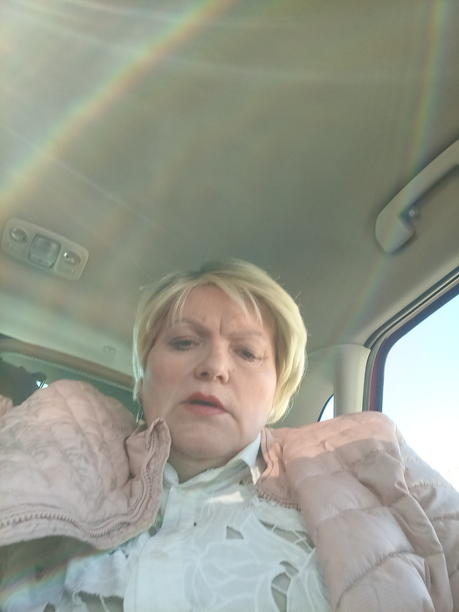 A selfie was taken inside a car. The subject is a mature woman with short blonde hair, wearing a white, possibly lace top and a light pink quilted jacket. The car's interior is visible, including the roof with a dome light, a window showing a bright sky, and a grab handle. A faint rainbow effect is cast across the roof of the car. The location is not discernible from the image and therefore cannot be identified as being in Vladimir, Russia.
