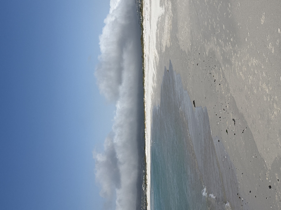 This image depicts a coastal scene in Kommetjie, South Africa, under a clear blue sky partially obscured by a low-lying cloud bank. The foreground shows a sandy beach with pale, fine-grained sand extending from the bottom right towards the middle ground. The sand varies in texture and moisture, appearing darker closer to the water's edge and lighter further inland. Scattered small dark rocks, shells, and fragments of seaweed are visible along the waterline. To the left, light turquoise-blue ocean water gently laps the shore, with minimal wave activity. The water's color transitions from a lighter hue at the edge to a deeper blue further out. A distinct horizon separates the water and land from the sky. In the mid-ground, a strip of land covered with sparse, dull green vegetation or scrub separates the beach from a distant landmass. A prominent horizontal band of white and grey cumulus clouds, appearing as mist or fog, hovers directly above this distant land and stretches across the entire horizon. Parts of a developed area, characterized by scattered white structures, are faintly discernible on the distant land beneath or within the cloud cover, particularly towards the right side of the frame. No individuals, animals, or significant man-made objects are present in the immediate foreground or mid-ground.