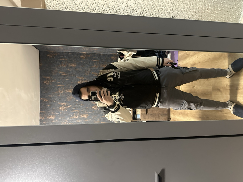 A male individual, appearing to be in his late teens or early twenties, is depicted in a full-length mirror selfie. He stands facing the mirror, holding a silver-colored smartphone with a light-colored case in his right hand, positioned to capture his reflection. His face is partially obscured by the phone and a dark blue or black hood pulled over his head. He is dressed in a black and cream/white varsity-style jacket with button closures and striped cuffs, worn over an unseen top. Grey cargo pants with side pockets cover his lower body. On his feet are dark blue slippers with light-colored fur lining. A light-colored backpack is visible on his back, partially covered by his right arm. A dark item, possibly keys, is held in his left hand, hanging at his hip. The background, reflected in the mirror, shows an interior room. The wall directly behind the individual features dark, textured wallpaper with bronze or copper-colored metallic accents. To the right of the individual, the wall has a white or light-colored geometric pattern. The floor is light wood-toned. Partially visible furniture includes a light-colored cabinet or dresser to the left of the individual. Various indistinct items, including a white garment and a purple object on the floor, are visible to the right. The mirror itself is framed by a thick, dark grey border, consistent with a wardrobe door, indicated by a handle on the left side. No identifiable external landmarks or specific interior details are present to determine a precise location within the city of Sofia, Bulgaria. The setting appears to be a private residential or domestic space.