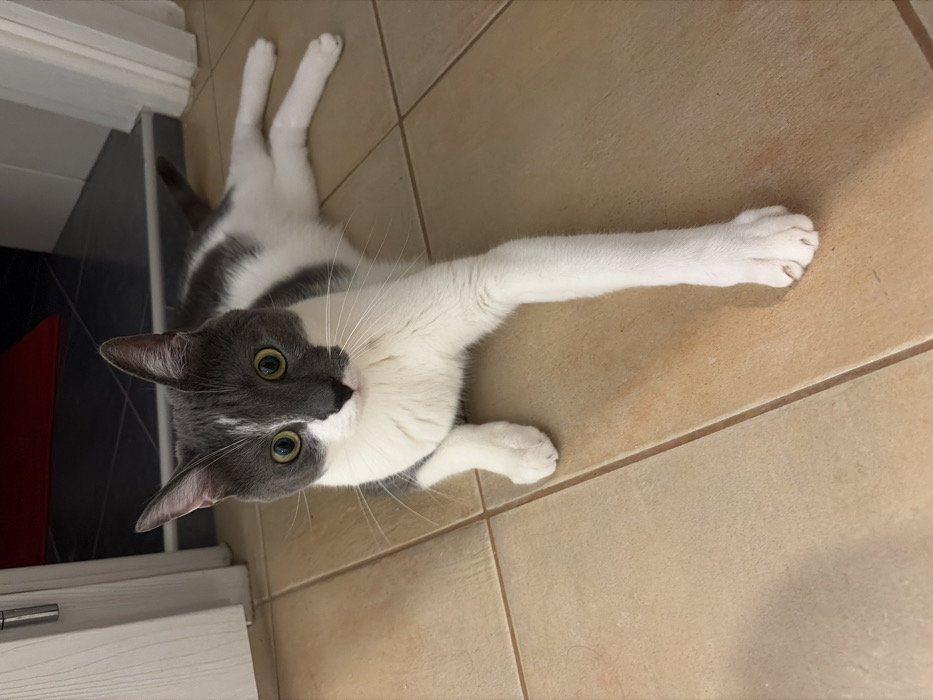 - "The scene depicts a domestic cat positioned on a light brown tiled floor within an indoor residential setting in Sofia, Bulgaria" by FM-R7RZz2, licensed under CC BY 4.0