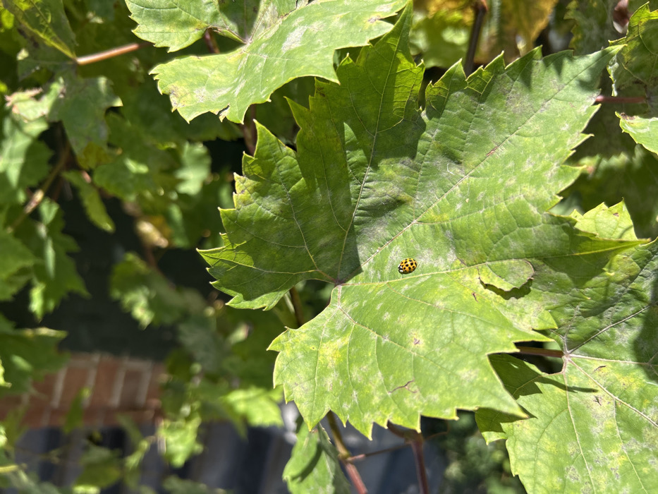 - "This image depicts a yellow ladybug with black spots stationary on a prominent, palmate green vine leaf, located in Amsterdam, Netherlands" by FM-JqEJc2, licensed under CC BY 4.0