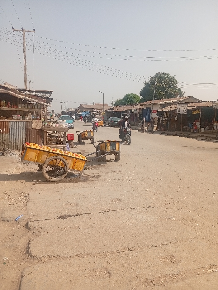 The image depicts a bustling street scene in an unspecified urban or semi-urban area within the city of Unknown, Unknown, under hazy daylight conditions. The primary thoroughfare is an unpaved or poorly paved road, light brown in color, showing dust and wear. On the left side of the street, a line of rudimentary market stalls or shops with corrugated metal roofs and wooden frameworks extends into the distance. Various goods, including bottles and containers, are visible on shelves and tables in front of these structures. A tall wooden utility pole with multiple overhead electrical or communication lines is positioned near the leftmost stalls. On the right side, a continuous line of single-story structures with corrugated metal roofs and walls borders the road. A large green-leafed tree stands behind some of these structures further down the street. The roadway is occupied by various vehicles and pedestrians. In the foreground-midground, a yellow two-wheeled handcart containing multiple yellow jerrycans is parked on the left side of the road. Further down, another similar yellow handcart is visible. Multiple motorcycles are present on the road; one dark-colored motorcycle with a male rider wearing a dark jacket is prominent on the right side, facing away from the viewer. Another male on a motorcycle in a white shirt is visible further down the street. A light blue car is also seen in the distance, traveling away. Several individuals are present, including pedestrians walking alongside the road and near the stalls on both sides. Multiple motorcycle riders are visible, primarily male. No direct interactions between individuals are clearly discernible. The sky is bright and hazy.
