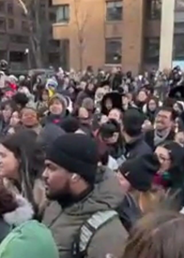 A large crowd of people stands in a city square. They are facing the same direction. The crowd consists of people of various ages and ethnicities. Most people are wearing winter clothing, including hats, coats, and scarves. Buildings are visible in the background. The weather appears to be cold, with some bare trees. Some people are holding up their phones, possibly taking pictures or videos. A few people are looking up and shouting.