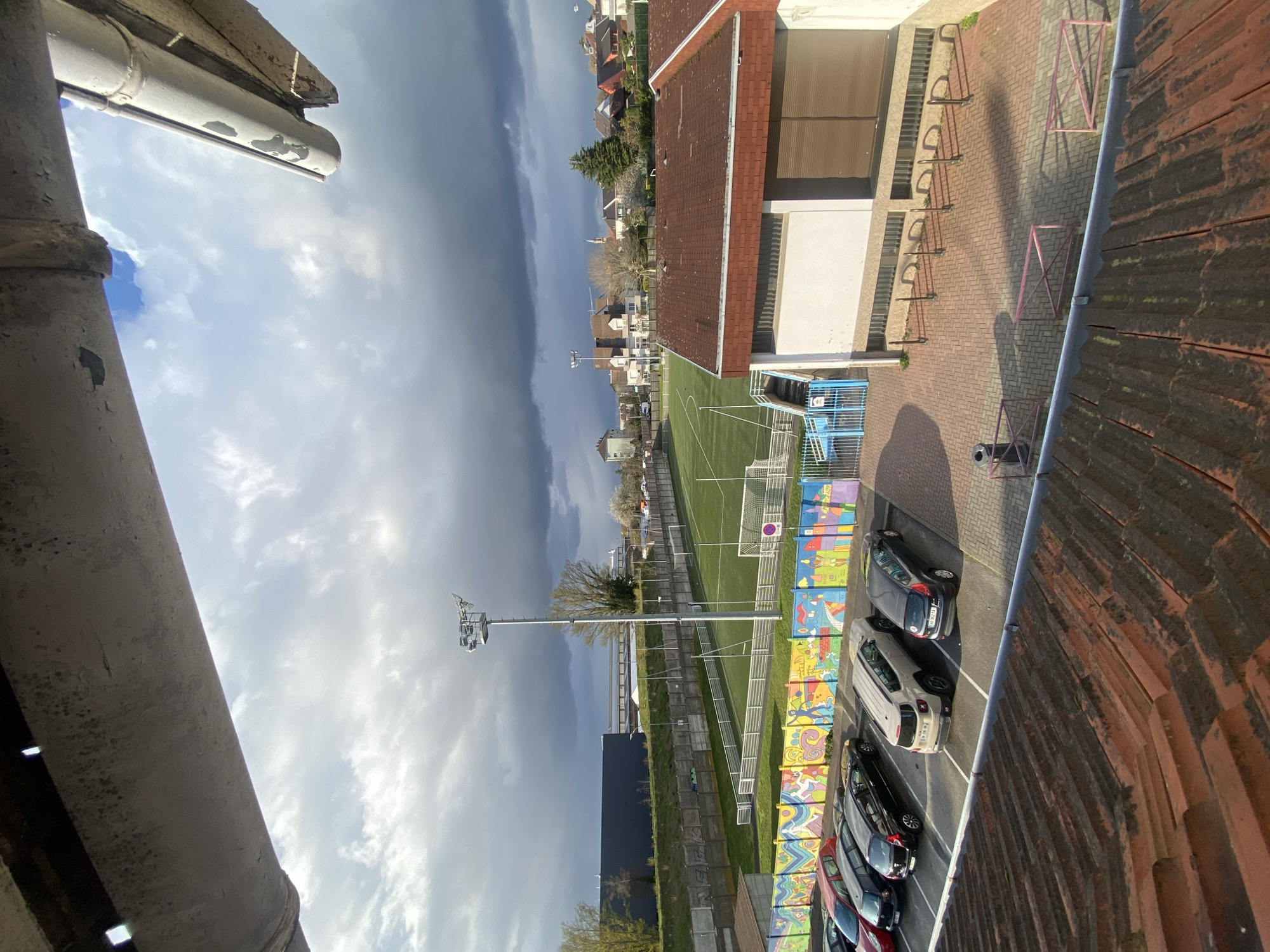 The image, taken from an elevated vantage point in Bischheim, France, offers a view of a local sports complex and surrounding urban area. The foreground is dominated by a section of a building, including a roof and gutter. Visible in the midground is a football field, identifiable by its green artificial turf and goalposts. Adjacent to the field is a parking area containing a number of cars. A row of colorful murals decorates the edge of the parking lot. A tall light pole with multiple lights is also present. Beyond the sports complex, residential buildings and trees are visible, indicative of a dense urban setting. The sky is overcast with dark, ominous storm clouds dominating the left side of the frame, while patches of lighter sky peek through on the right.