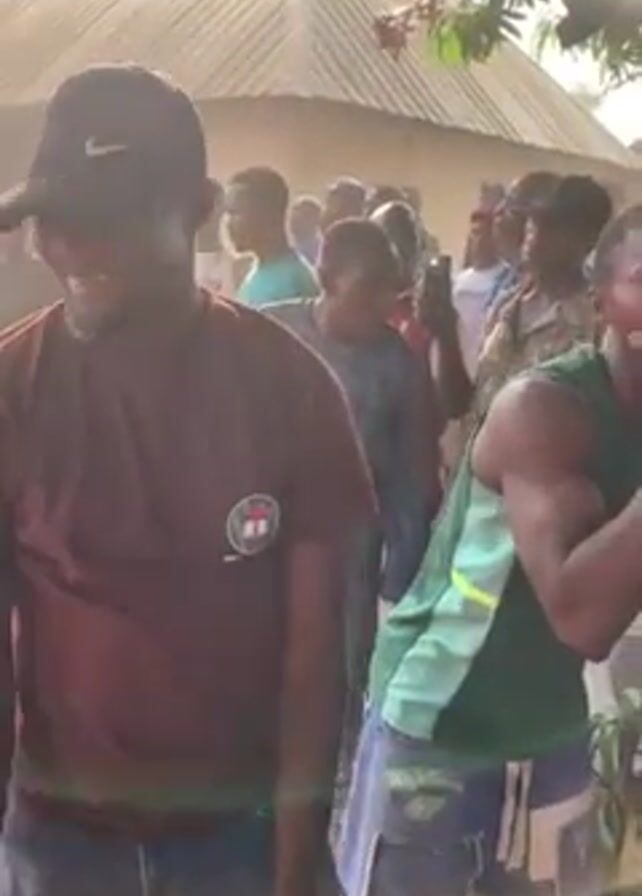 group of people outdoors in a dusty environment. Most are wearing casual clothing. The person closest to the camera is wearing a maroon shirt, blue jeans, and a black baseball cap. Another person is wearing a green tank top and patterned shorts. Some people in the background are holding phones. A building with a corrugated roof is visible in the background. There appears to be a festive or celebratory atmosphere.