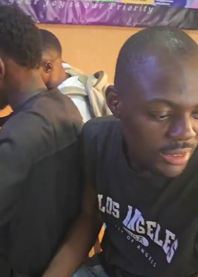 man in a black shirt with "LOS ANGELES CITY OF ANGELS" printed on it, seated indoors. He's talking and makes a hand gesture, displaying two fingers. In the background, other individuals are present and a banner with text and the words "Computer & Accessories" is visible. The environment appears to be a small business or office space.