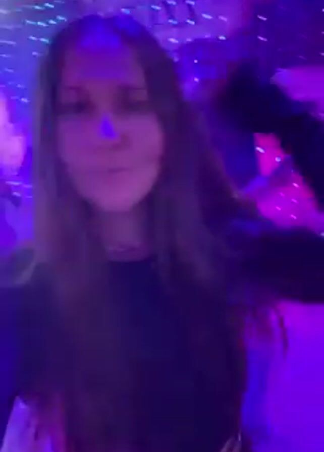 A young woman with long brown hair is filming herself at a dance club or party, lit with neon-blue and purple lights. She is wearing a black long-sleeved top and a silver chain. Other people can be seen behind her. The lights are moving in a way that suggests a dance floor. The woman smiles into the camera.
