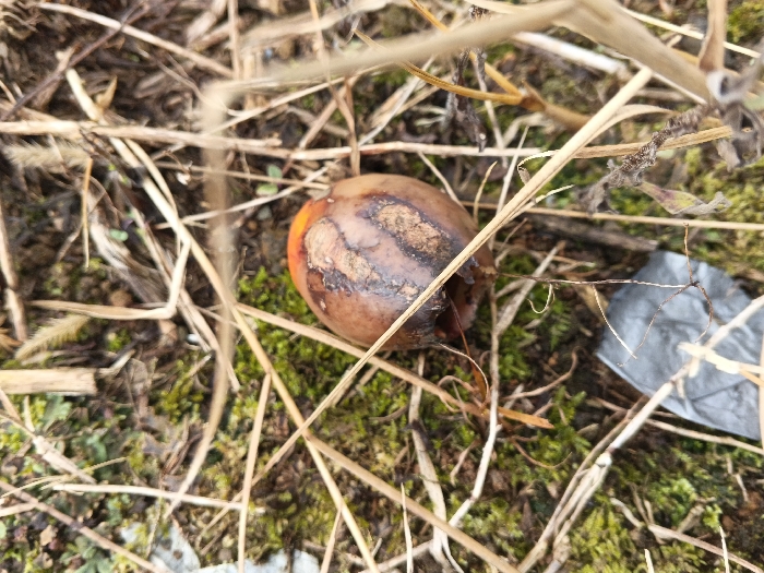 A decaying apple sits amidst dried grass and green moss. The apple's skin is brown with dark, textured patches indicating rot. A portion displays a bright orange hue, contrasting with the decaying areas. Thin, dry grass blades crisscross around the apple and scattered over the mossy ground. A piece of reflective gray material lies to the right of the fruit, near thin, brown stalks.