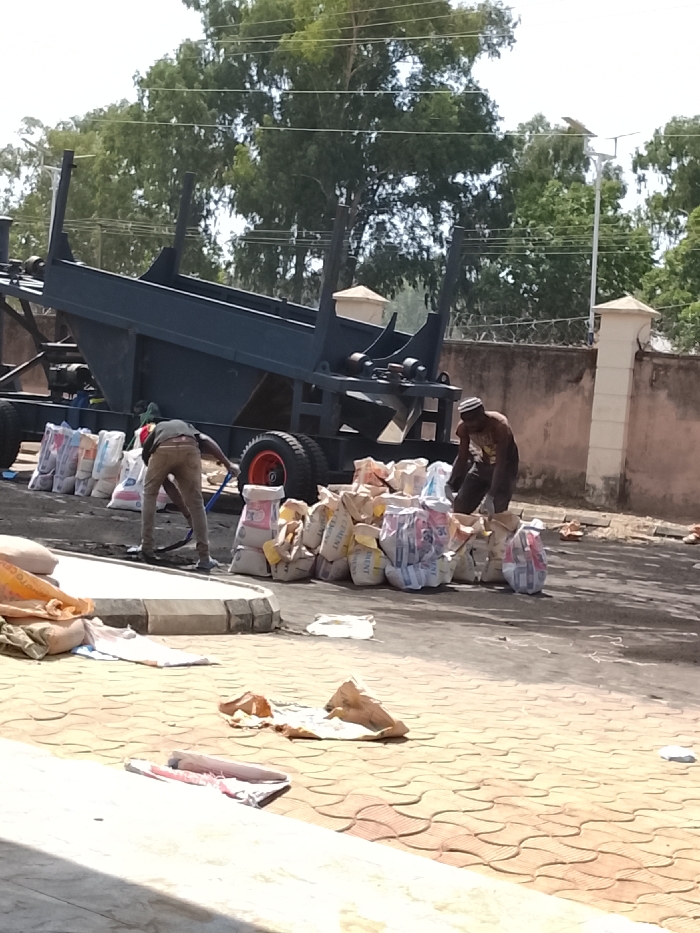 This image depicts an outdoor construction or material handling scene in Bukuru, Nigeria. Two adult males are engaged in manual labor, moving and stacking numerous sacks of material, primarily labeled "CEMENT." **Subjects:** * **Male 1 (Left):** Dressed in a dark red long-sleeved shirt and light brown trousers, bent at the waist, holding a blue-handled tool, possibly a shovel, on the ground. * **Male 2 (Right):** Dressed in dark clothing and wearing a light-colored cap, standing with both hands on a sack, actively handling materials. * **Machinery:** A large, dark gray mobile construction apparatus, resembling an aggregate feeder or concrete batching equipment, is positioned behind the men. It features a large hopper, a conveyor-like mechanism, and orange-rimmed black wheels. * **Sacks:** Numerous sacks, predominantly white, grey, and multicolored, are stacked in organized rows and piles on the darker ground surface. Several sacks explicitly display the word "CEMENT." * **Ground:** The foreground features a patterned pavement of light brown interlocking bricks with a wavy design. The area where the men are working is a darker, unpaved surface, possibly dirt or asphalt. * **Structures:** A light-colored wall, topped with coiled barbed wire and decorative cream-colored pillars, runs across the mid-ground. * **Vegetation:** Numerous tall green trees are visible in the background. * **Utilities:** A white utility pole with a mounted solar panel array is visible in the background, to the right of the trees. * **Debris:** Scattered paper, plastic, and fragments of empty bags are present on the paved foreground. **Actions and Interactions:** The two males are actively involved in the physical movement and organization of the material sacks, likely in preparation for or during a construction process. Their postures indicate manual labor. **Environment:** The scene is illuminated by bright daylight, suggesting clear weather conditions. The setting appears to be an open-air yard or a section of a construction site.