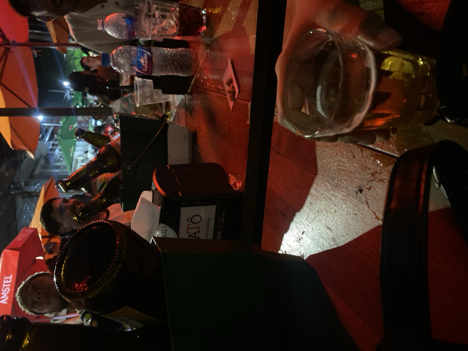 A bustling outdoor bar scene under red umbrellas. People sit at a wooden table cluttered with empty bottles, plastic cups, and water bottles. A hand holds a glass of beer. An ice bucket filled with beer bottles sits on the table. The atmosphere is dimly lit.