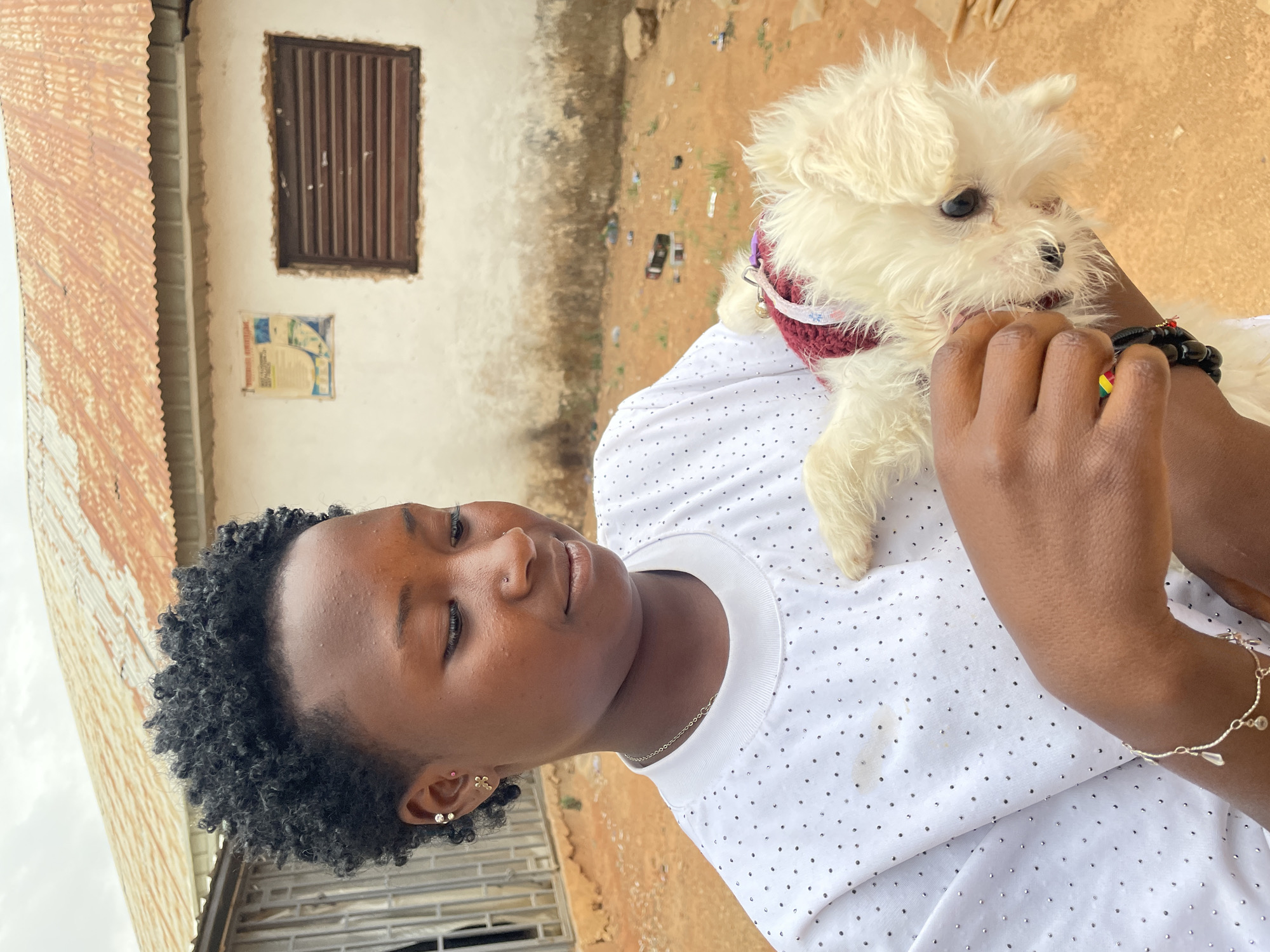 A young woman with short, curly black hair is holding a small, fluffy white dog. She is wearing a white t-shirt with black polka dots and a delicate silver necklace. The dog has a red collar. The woman is wearing earrings and a bracelet. The background includes a building with a brown window and a corrugated metal roof, along with what appears to be a dirt ground. Based on the context clues, it is assumed that this image was taken in Jos, Nigeria.