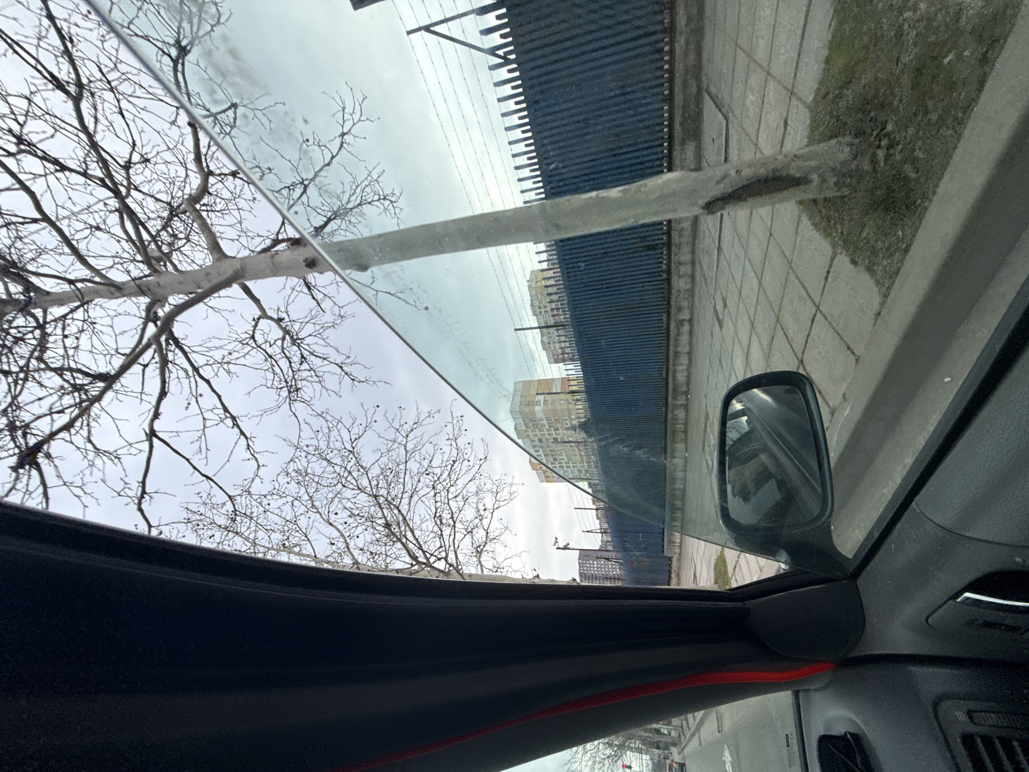 The image depicts an urban street scene in Sofia, Bulgaria, viewed from the interior of a vehicle, specifically from the passenger side looking forward and slightly right. **Interior:** The foreground reveals a dark grey/black car interior, including a section of the door panel with a chrome handle, a portion of the dashboard featuring an air vent, and the A-pillar with a vertical red accent stripe. An external rearview mirror, positioned to the right of the A-pillar, reflects a blurry image of the vehicle's interior. **Exterior:** Outside the vehicle, a paved sidewalk runs parallel to the direction of travel. Several bare-branched deciduous trees, indicative of late autumn or winter, are present. A prominent tree with light-colored bark stands on the sidewalk in the mid-right, partially obscured by the vehicle's side window. Beyond the sidewalk, a tall, dark blue metal fence, appearing to be a palisade or similar security barrier, stretches horizontally across the midground. Multiple strands of barbed wire are visible along the top of this fence. In the background, behind the fence, several multi-story residential buildings with various facades (including light beige and darker tones) are visible under an overcast, grey sky. Further to the left, a street is visible, with a red traffic light illuminated in the distance, suggesting a forthcoming intersection. Another vehicle can be faintly observed on the street in the far left background. No individuals are explicitly visible.