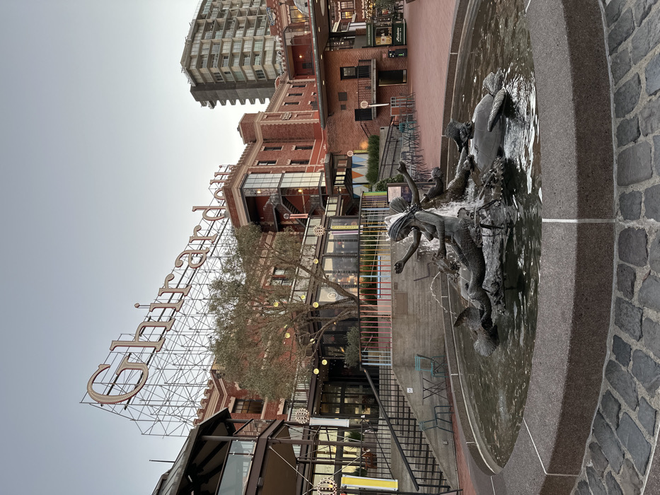 A tilted outdoor shot showcases a bustling urban scene. A large metal sign, possibly advertising a business, is positioned prominently in the foreground. Red brick buildings, including a high-rise, form the backdrop. A fountain with intricate sculptures stands to the right, adding movement with flowing water. The surrounding area features cobblestone paths and hints of outdoor seating, suggesting a vibrant public space.