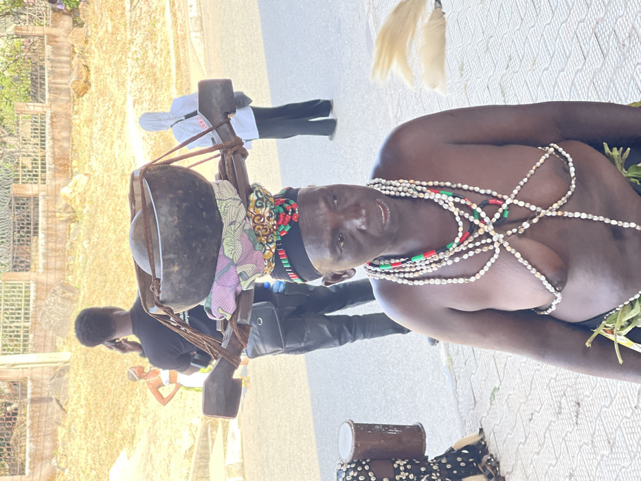 The image captures an outdoor scene in Jos, Nigeria, under bright daylight. In the foreground, a dark-skinned individual, likely an adult female, is seated or kneeling, facing slightly right with a neutral expression and mouth slightly ajar. She is bare-chested, adorned with numerous strands of light-colored shell beads forming layered necklaces and a harness-like arrangement across the chest and mid-torso. Several necklaces also incorporate red, green, and black beads. A black headband is worn on her forehead, topped with additional colorful beaded bands (red, green, black) supporting a head-borne load. This load comprises folded, multicolored fabric (pink, purple, green, white), a wooden carrying frame, and two dark, bowl-shaped objects (likely calabashes) of different sizes, with a smaller, light-colored spherical object nested within the upper bowl, all secured with brown ropes. A green, leafy skirt or wrap is visible around her waist. To the left of the main subject, a section of another person wearing a black and white patterned garment is visible, along with a small, brown cylindrical drum on the paved foreground surface, which consists of interlocking concrete tiles. In the mid-ground, a dark-skinned man with short dark hair, wearing a black t-shirt and dark trousers, stands with his back to the viewer, holding a black smartphone to his right ear. He has a black messenger bag slung across his left shoulder. To his left, a light-skinned person in a white top and light-colored skirt stands with hands on hips, facing left. To the man's right, another person in a white hooded jacket and dark trousers also stands with their back to the viewer. A light-colored, fluffy object rests on the ground on the far right. The background consists of an asphalt road, beyond which is a low concrete wall topped with a wire fence. Further back, a dry, yellowish-brown hillside with sparse vegetation and scattered rocks is visible under a clear, bright sky.