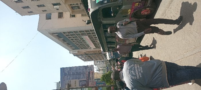 The image captures a daytime street scene in downtown Nairobi, Kenya, with multiple individuals walking and public transport vehicles present