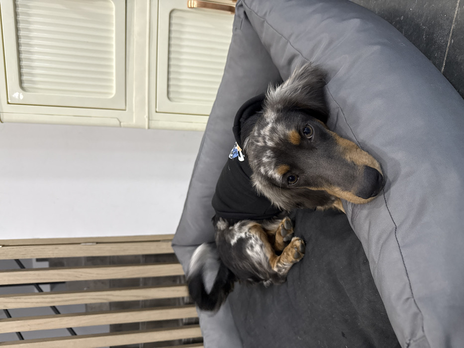 - "An indoor scene in Zapopan, Mexico, features a long-haired dapple dachshund resting within a gray fabric dog bed" by FM-AIn2W2, licensed under CC BY 4.0