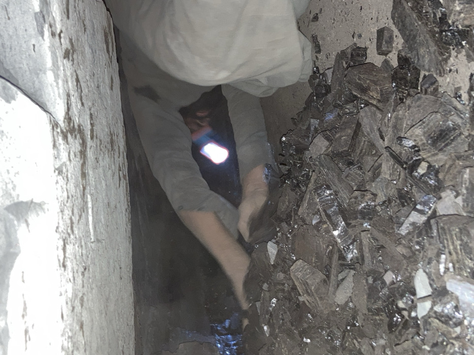 A person is walking through a narrow, dark passage. A flashlight shines ahead, illuminating the passage filled with dark, shiny materials, possibly minerals or crystals. The walls of the passage appear to be made of rough, unpolished concrete. The person is wearing light-colored clothes and appears to be wading through water. The overall scene suggests an underground exploration or mining activity.