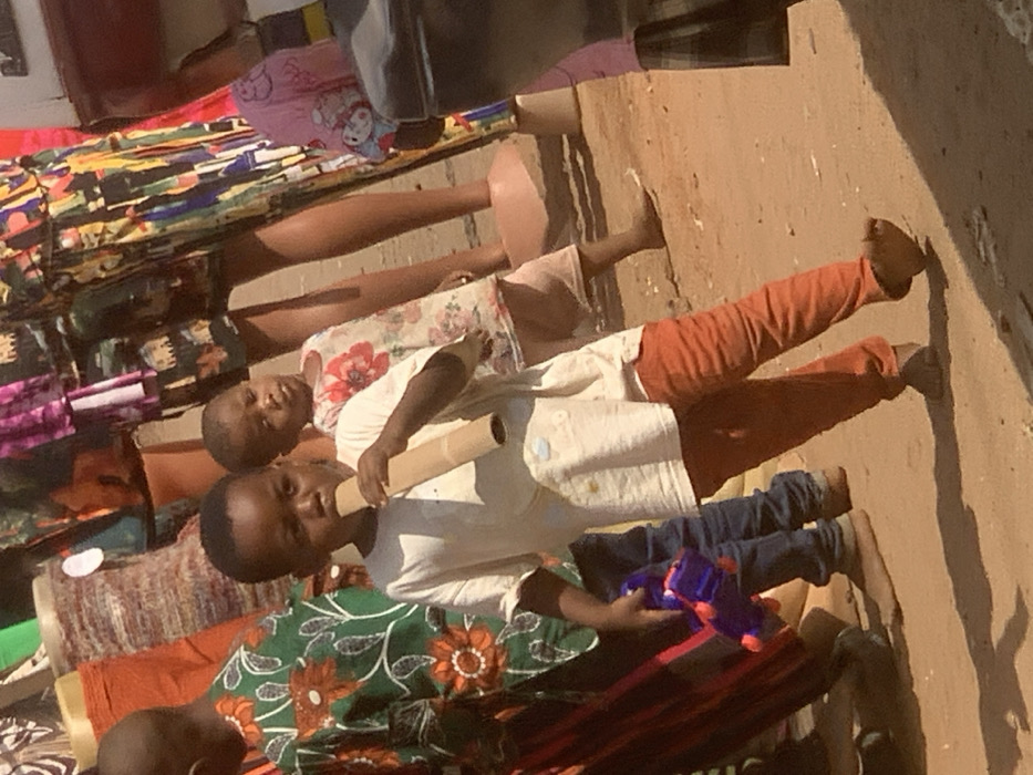 This image captures an outdoor scene, likely a market street, in Onitsha, Nigeria, under bright daylight. The primary subject is a young Black child, seen from the waist up, wearing a white short-sleeved t-shirt and orange trousers, barefoot. This child holds a light brown cardboard tube to their mouth with both hands, as if playing a horn, and simultaneously holds a purple and orange toy blaster in their left hand. The child looks directly at the viewer. To the right and slightly behind, another young Black child in a white floral-patterned dress is visible, also barefoot, looking towards the right side of the frame. In the background, fragmented views of adults and what appear to be market stalls are present. Partially visible adults wear patterned fabrics, including a green garment with orange floral designs and a multi-colored abstract patterned dress. Several bare legs, some potentially belonging to mannequins, are visible, standing on light brown ground. The ground is unpaved, appearing as dusty light brown earth, and strong sunlight creates clear shadows.