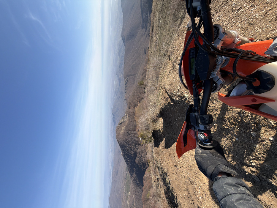 - "A first-person perspective shows an orange and white dirt bike stationary on a dry, reddish-brown dirt trail located at a high elevation in the vicinity of Мътеница, Bulgaria" by FM-U0N8H2, licensed under CC BY 4.0