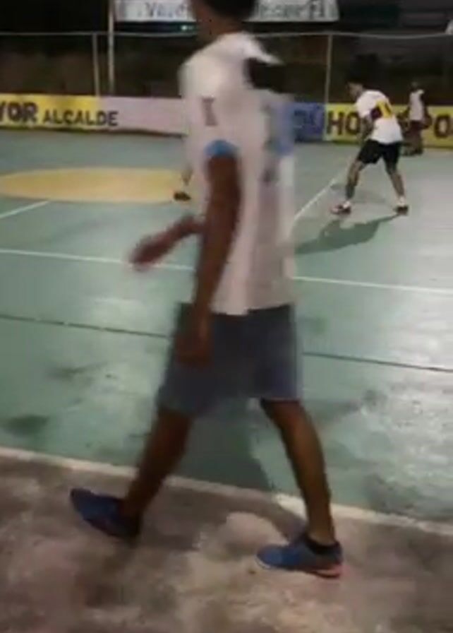 A group of five men are on an outdoor sports court at night. The court is green with white lines, and there is a small circular yellow area in the center. One man, wearing a lime green and yellow athletic shirt, is dribbling a red soccer ball. Another man, wearing a black and white athletic shirt, defends him. Two other men wearing different colored shirts are observing them. Another man, wearing a light blue and white athletic shirt and dark shorts, stands in the foreground with his back towards the camera. There is a low wall along the court with lettering on it and a chain link fence behind that. The lighting is dim.