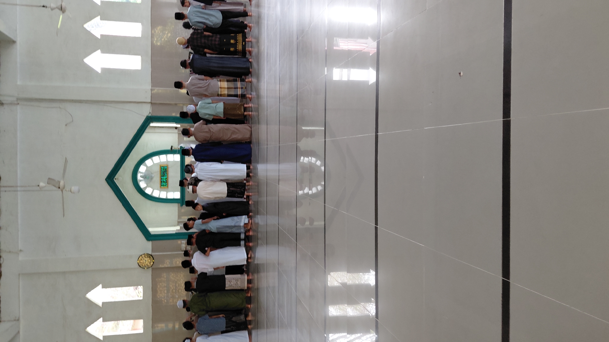 The image depicts the interior of a mosque prayer hall in Lhokseumawe, Indonesia