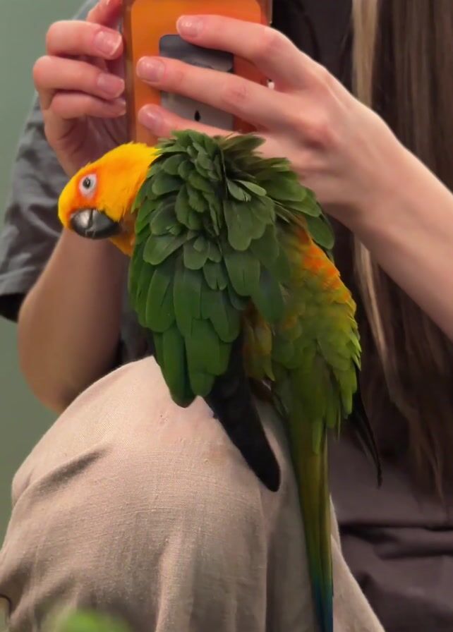 A person is holding a phone to take a picture or video of a parrot perched on their knee. The parrot has yellow on its head and face and green feathers covering the rest of its body with some orange markings. The person is wearing a gray shirt and beige pants. The phone has a colorful case on it. The parrot preens its feathers. Another yellow object is visible in the foreground, slightly out of focus.
