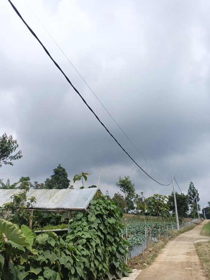 This image depicts a rural scene in Nam Sa Lat, Myanmar, under an overcast sky. Two dark electrical wires extend diagonally from the upper left to the mid-right. In the mid-ground on the left, a small, basic structure with a translucent roof is heavily covered by dense, dark green climbing vines. To the right of this structure, a cultivated field is visible, containing rows of green, leafy crops, partially covered by black plastic mulch. A light-colored utility pole stands on the right side of the field, supporting one of the electrical wires. A narrow, light-colored concrete or dirt path runs along the right side of the frame, curving slightly uphill into the distance. Various trees and shrubs populate the landscape, with a line of trees visible on a distant hillside. No people or animals are present.