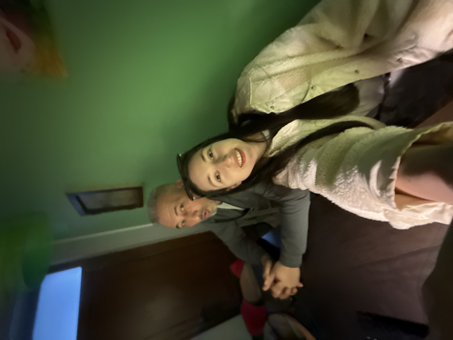 An indoor scene in Sofia, Bulgaria, features two individuals: an adult female in the foreground and an adult male partially behind her. The female, with long dark hair, wears sunglasses atop her head and a light-colored, possibly off-white, fuzzy jacket over a white top. She is smiling and appears to be holding the camera. The male, with short gray hair and a mustache, wears a gray long-sleeved shirt over a white shirt, and his hands are clasped together in front of him. His mouth is slightly open. Both individuals are seated. The background consists of a bright green wall. To the left, a dark brown door is visible, and above it, a window or opening reveals a bright blue sky. A framed object hangs on the green wall to the left of the male. Partially visible on the far left are red and light-colored footwear. A dark, flat surface occupies the lower foreground. The lighting is moderate, with a greenish hue cast on the wall.