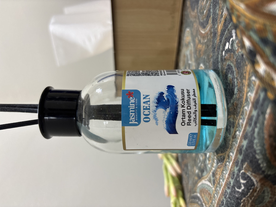 - "A "Jasmine Beauty & Care OCEAN" reed diffuser stands prominently on a patterned fabric surface in Mu'adammiyat ash-Sham, Syria" by FM-tvSGy2, licensed under CC BY 4.0