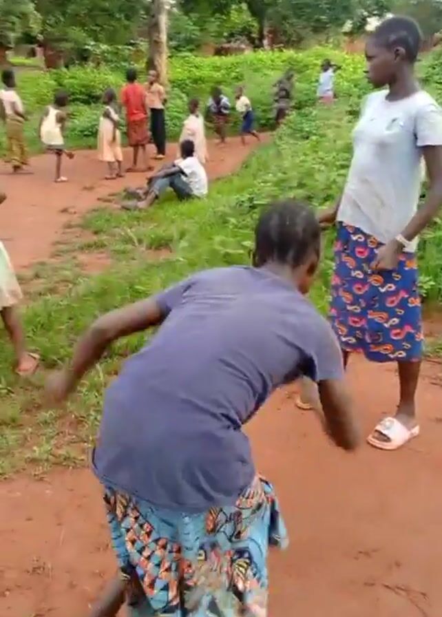 A group of children are playing in a grassy area. One girl is throwing a rock, another girl is standing and watching. A group of children stand in the background, some playing. One person is seated in the background. The ground is red dirt. Trees surround the area. The girl throwing the rock is wearing a blue t-shirt and a patterned skirt. The other girl is wearing a white t-shirt and a patterned skirt, and pink sandals.
