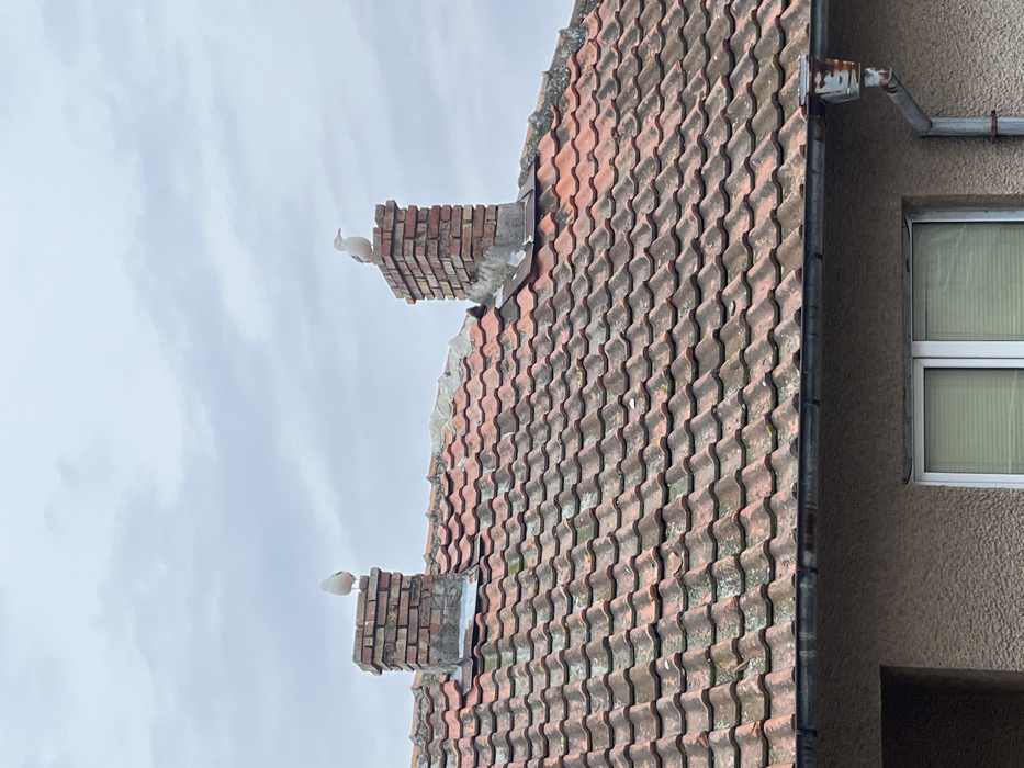 The image presents a residential rooftop scene in Tsarevo, Bulgaria, under an overcast sky. Two seagulls are positioned atop two distinct brick chimneys. The seagull on the left chimney faces away from the viewer, while the seagull on the right chimney faces toward the right side of the frame. The roof is constructed with numerous reddish-orange, pan-style tiles, exhibiting weathered surfaces with moss and discoloration. A grey metal gutter system runs along the lower edge of the roof, connecting to a visible downspout on the right, both showing signs of rust and deterioration. Below the gutter, a segment of a beige-colored building wall with a stucco-like texture is visible, containing a horizontally oriented window with white frames and closed interior blinds.